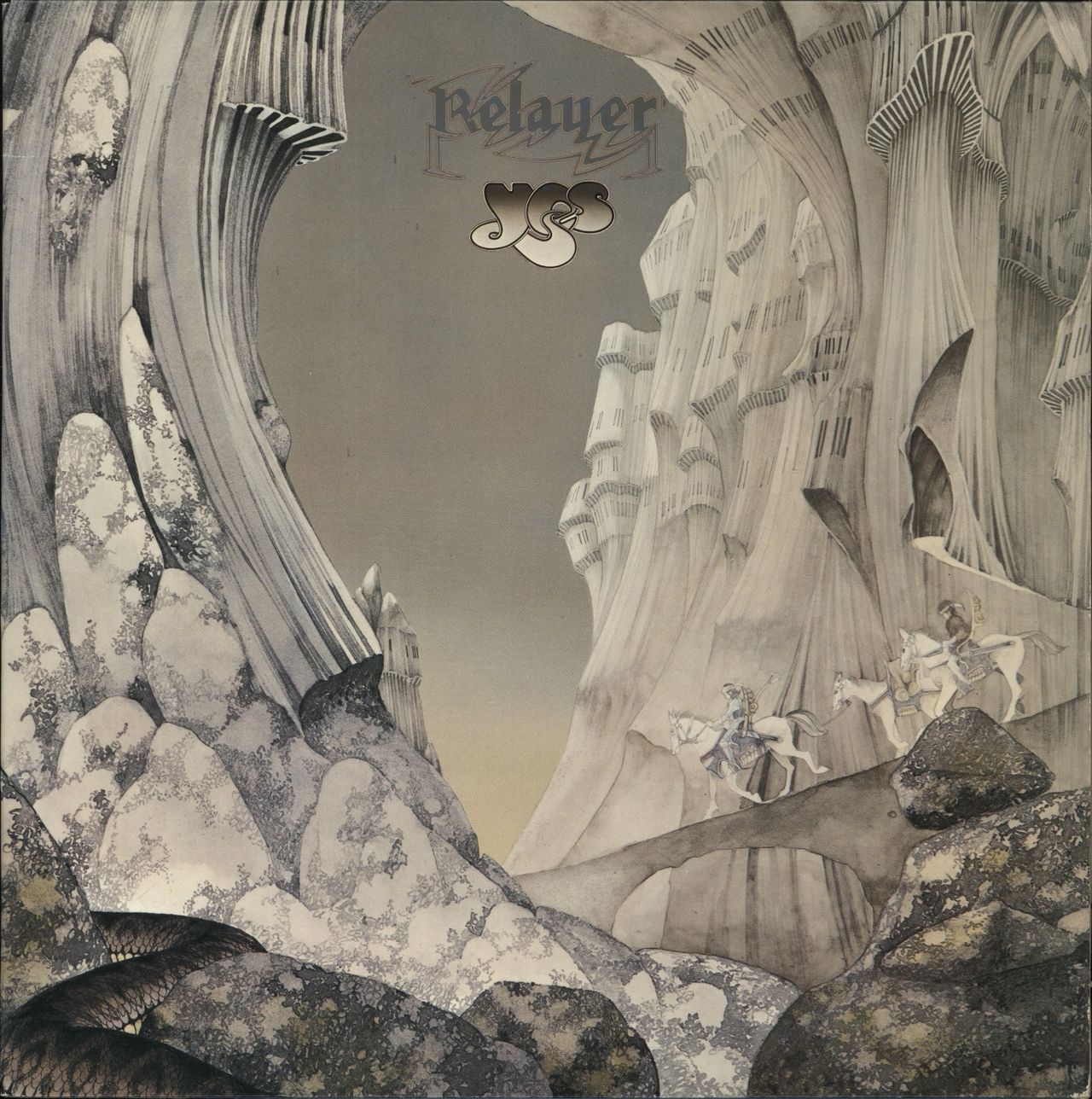 YES Relayer (1974 UK 3-track LP with picture labels, known for being influenced by Patrick Moraz who took over for this album whilst Rick Wakeman temporarily departed the band. Moraz's more eclectic, percussive style of playing marked a unique soundingYes album, gatefold picture sleeve . The sleeve has minimal edge wear and the inner carries some mild foxing whilst vinyl looks seldom played K50096)