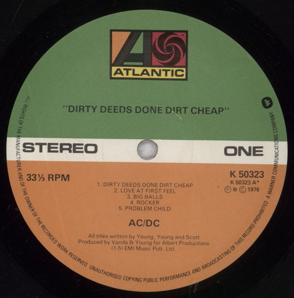 AC/DC Dirty Deeds Done Dirt Cheap (1976 UK green & orange Atlantic label 9-track LP, the third studio album by Australian hard rock band, picture sleeve with illustrated lyric inner. The sleeve shows minor wear, the inner has some light foxing, and the vinyl remains in Excellent condition showing just some minor cosmetic scuffs K50323)