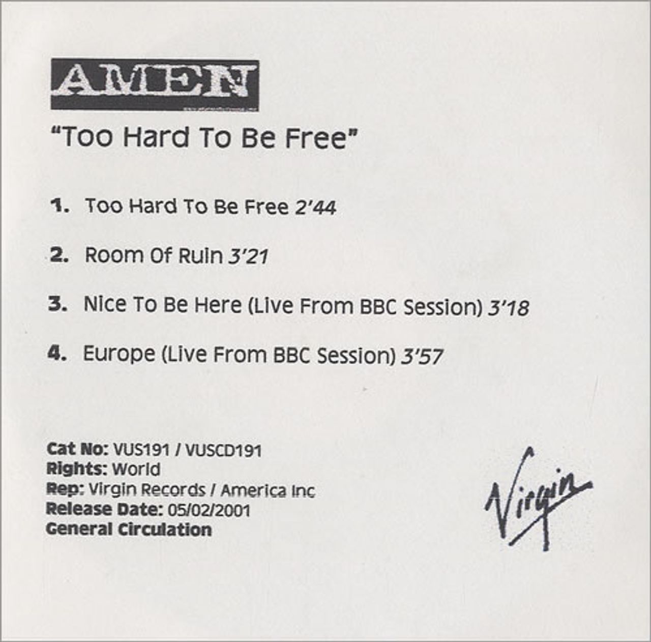 AMEN Too Hard To Be Free (UK 4-track recordable CD-R acetate featuring the Live recordings of Nice To Be Here and Europe from their BBC session as well as Room Of Ruin. Custom printed disc with title/tracklisting insert)