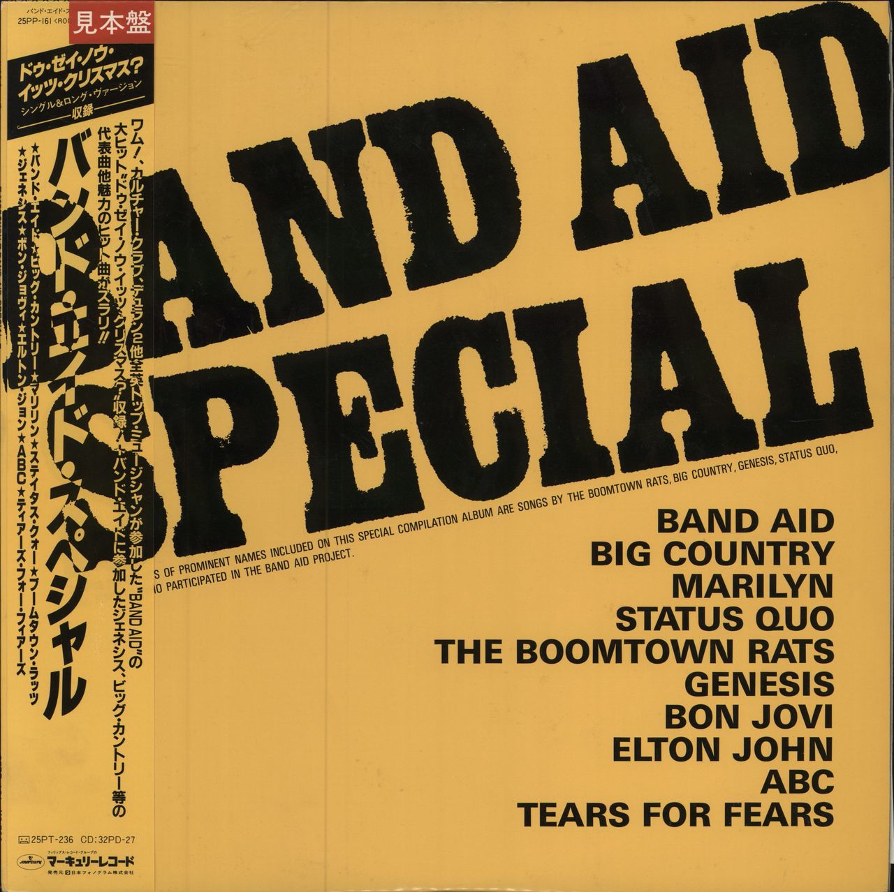 BAND AID Band Aid Special (1985 Japanese-only 12-track LP featuring the full 6:13 12" Mix of Do They Know It's Christmas, also including Feed The World plus Runaway by Bon Jovi, Elton John's Sad Songs, Status Quo's Marguerita Time & Mothers Talk by Tears For Fears. Comes housed in a unique title sleeve complete with a Japanese/lyric insert & promo stickered obi-strip. The sleeve shows minimal wear & the vinyl appears near mint 25PP-161)