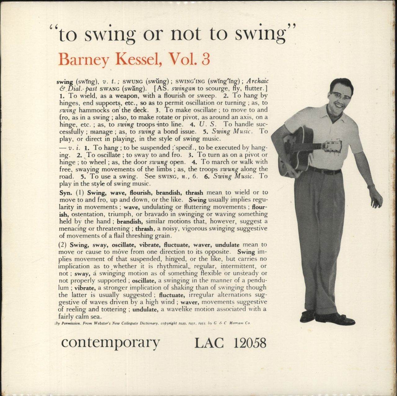 BARNEY KESSEL Vol. 3, To Swing Or Not To Swing (1956 UK first press 11-track deep groove mono LP, also starring Harry Edison, Bill Perkins, Jimmy Rowles, Al Hendrikson, Red Mitchell & Shelly Manne, fully laminated flipback picture sleeve. Thesleeve is Excellent with minimal ageing & the vinyl is clean & in Excellent condition with few signs of play LAC12058)