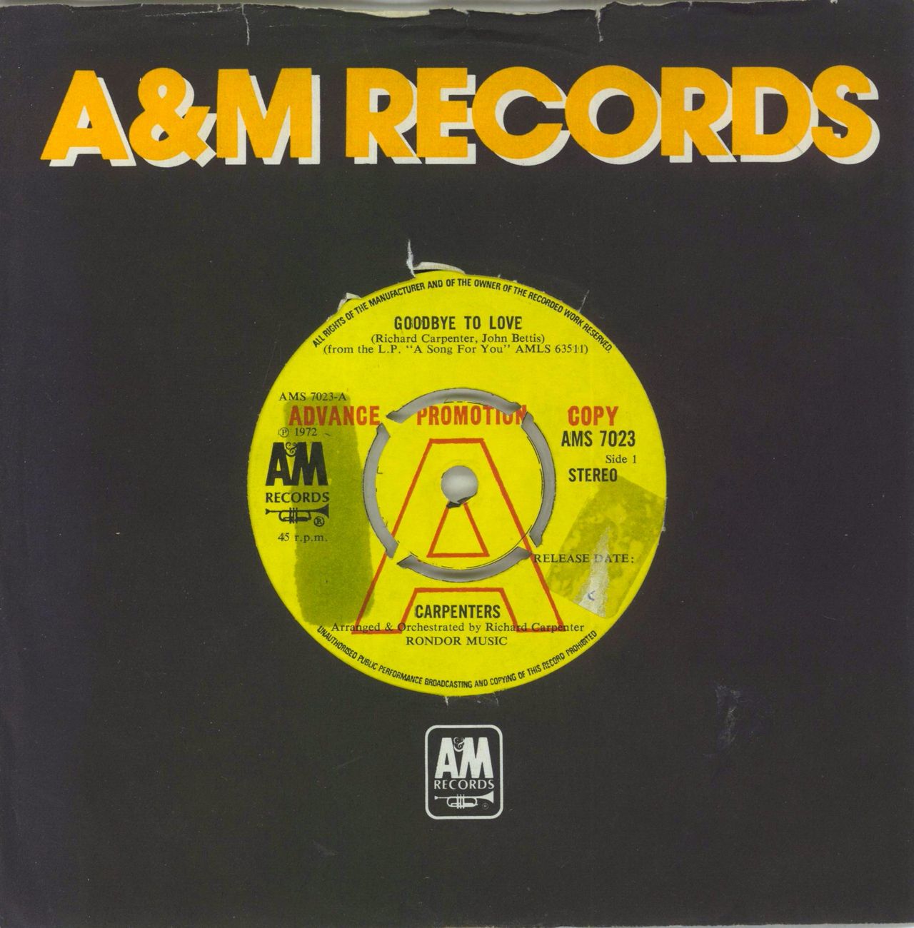 CARPENTERS Goodbye To Love (1972 UK A-Label 7" single with intact four prong centre, also including I Won't Last A Day Without You, A&M die cut paper sleeve AMS7023)