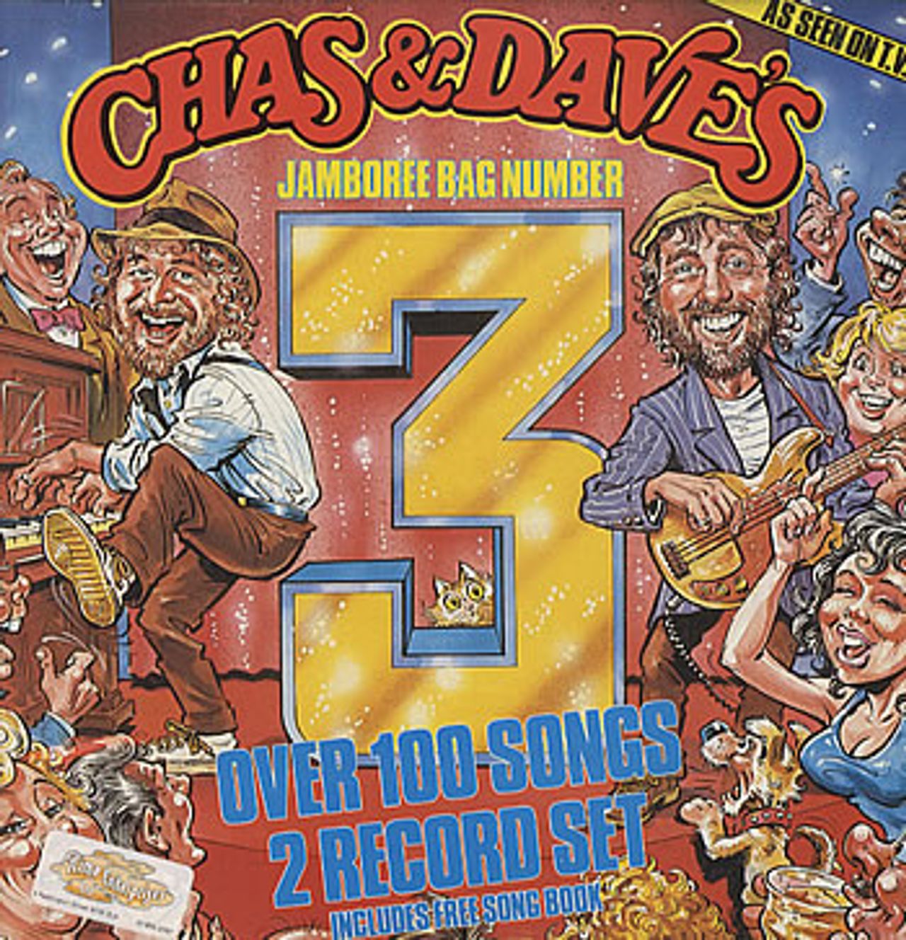 CHAS & DAVE Jamboree Bag Number 3 (1985 UK double LP of over a hundred songs, featuring a side each devoted to 'Knees Up', 'Rock N Roll', 'Old Time Boogie' & 'Waltz', complete with a sixteen page lyric booklet soyou can sing along, gatefold picture sleeve. The sleeve shows just a little light shelfwear & the vinyl remains in excellent condition with few signs of play. Gertcha! ROC914)