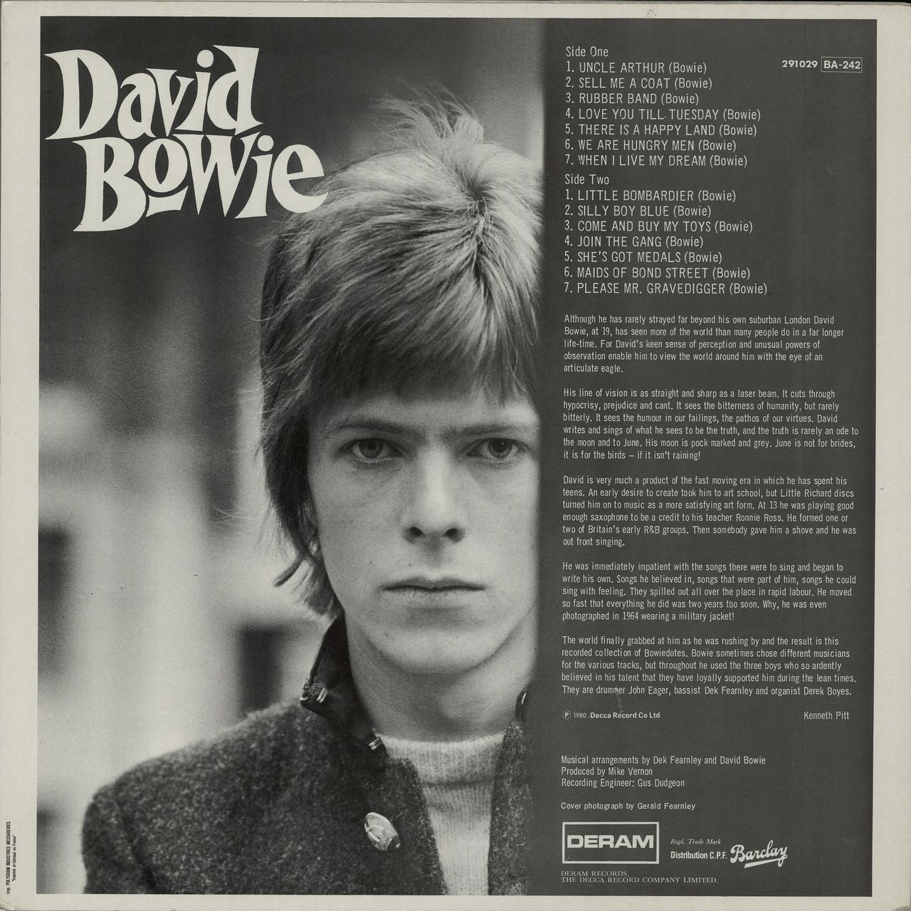 DAVID BOWIE David Bowie (1980 French edition of the 1967 14-track stereo vinyl LP, the late Bowie's eponymous debut album, distributed by Barclay. The picture sleeve replicates the original album's artwork with liner notes printed on the back and has just a little shelfwear to the edges, (the beginnings of a split to top edge) while the vinyl has only light signs of play evident. A fantastic example of the Bowie's first record and the first pressing for the French & European market!)