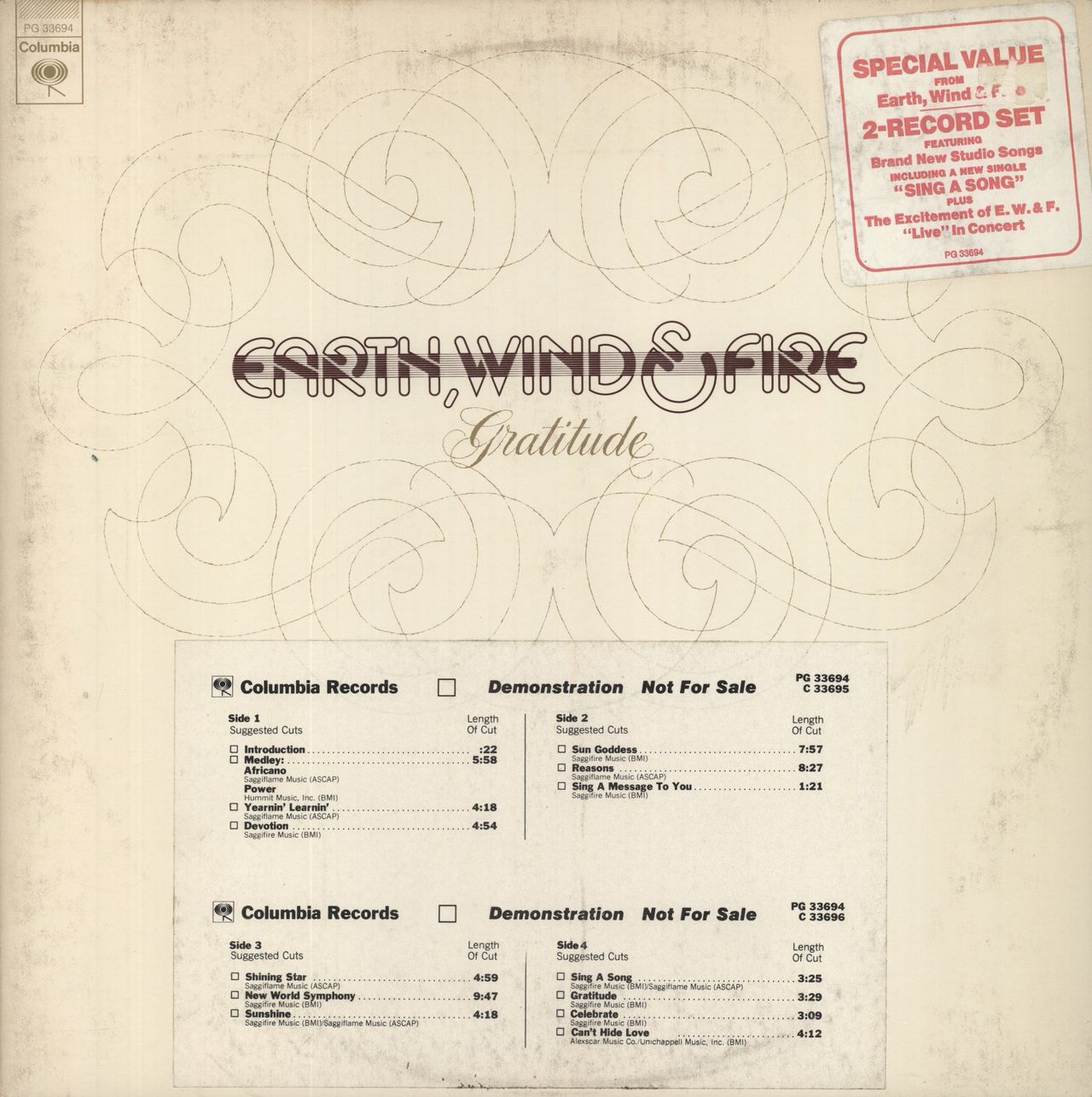 EARTH WIND & FIRE Gratitude (1975 US 10-track white label promotional vinyl LP, housed in a hype-stickered gatefold picture sleeve with radio timing strip attached to the front and gold 'Demonstration' stamp on the reverse plus illustrated/credit inners. The sleeve shows a little discolouration, whilst the vinyl looks barely played PG33694)