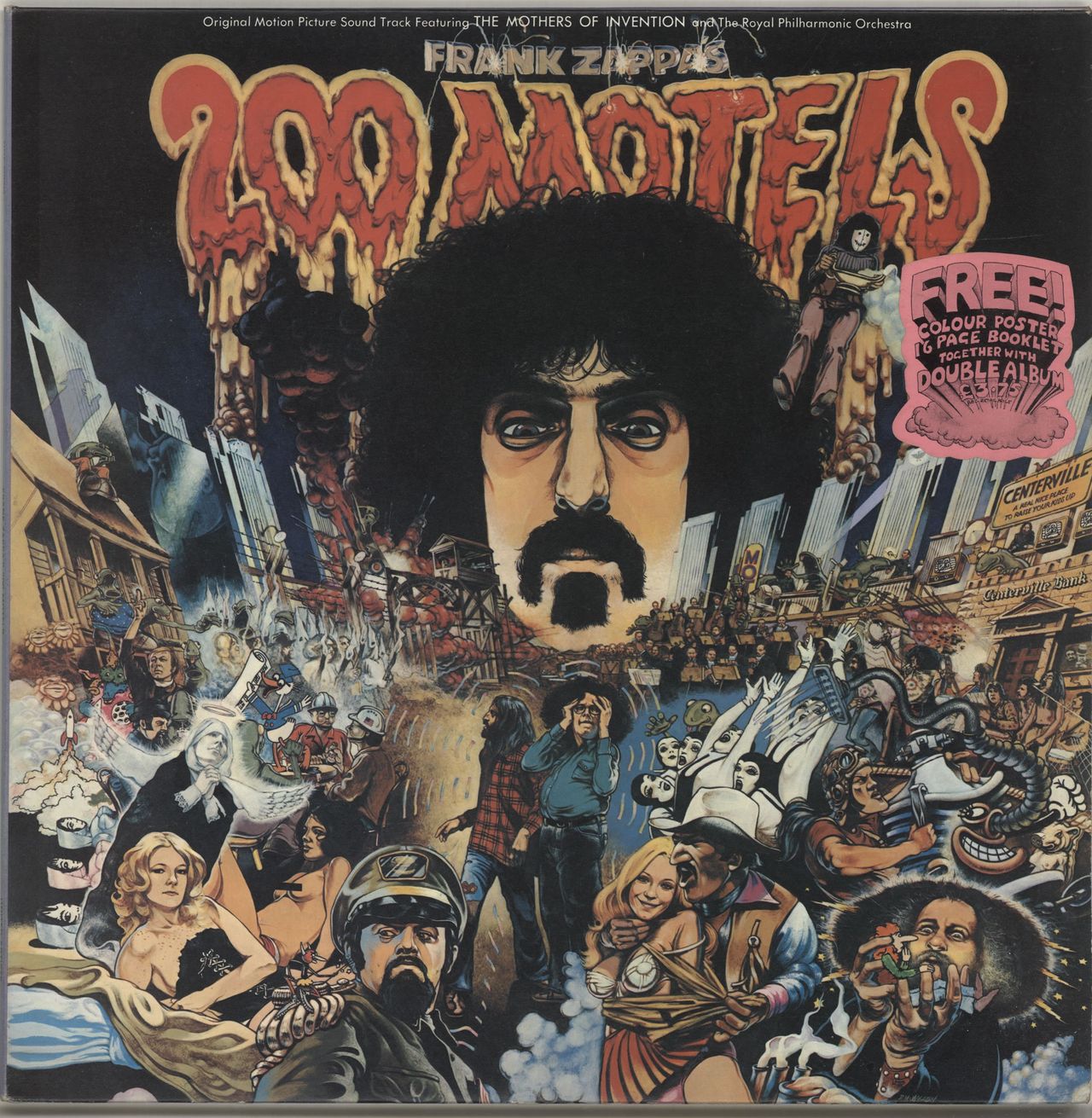 FRANK ZAPPA 200 Motels (Rare 1971 UK 34-track double LP soundtrack to Zappa's surreal movie. This hard to find first press is complete with the rather beautiful and even harder to find fold-out colour poster plus 16-page illustrated booklet packed with stills from the film. The scarce poster shows no signs of being displayed. The gatefold stickered sleeve shows obvious edge scuffing (especially to spine) and the vinyl reveals light signs of play only - very nice indeed! UDF50003)