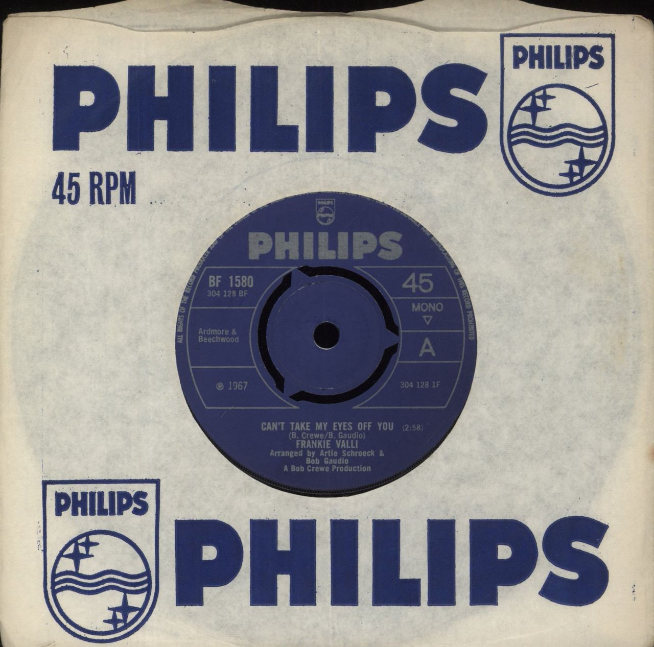 FRANKIE VALLI Can't Take My Eyes Off You (1967 UK 7" single with three-prong centre, also featuring the b-side 'The Trouble With Me', Philips die-cut company sleeve. The vinyl is clean & grades EX/EX- with some light paper hairline scuffs notaffecting play BF1580)
