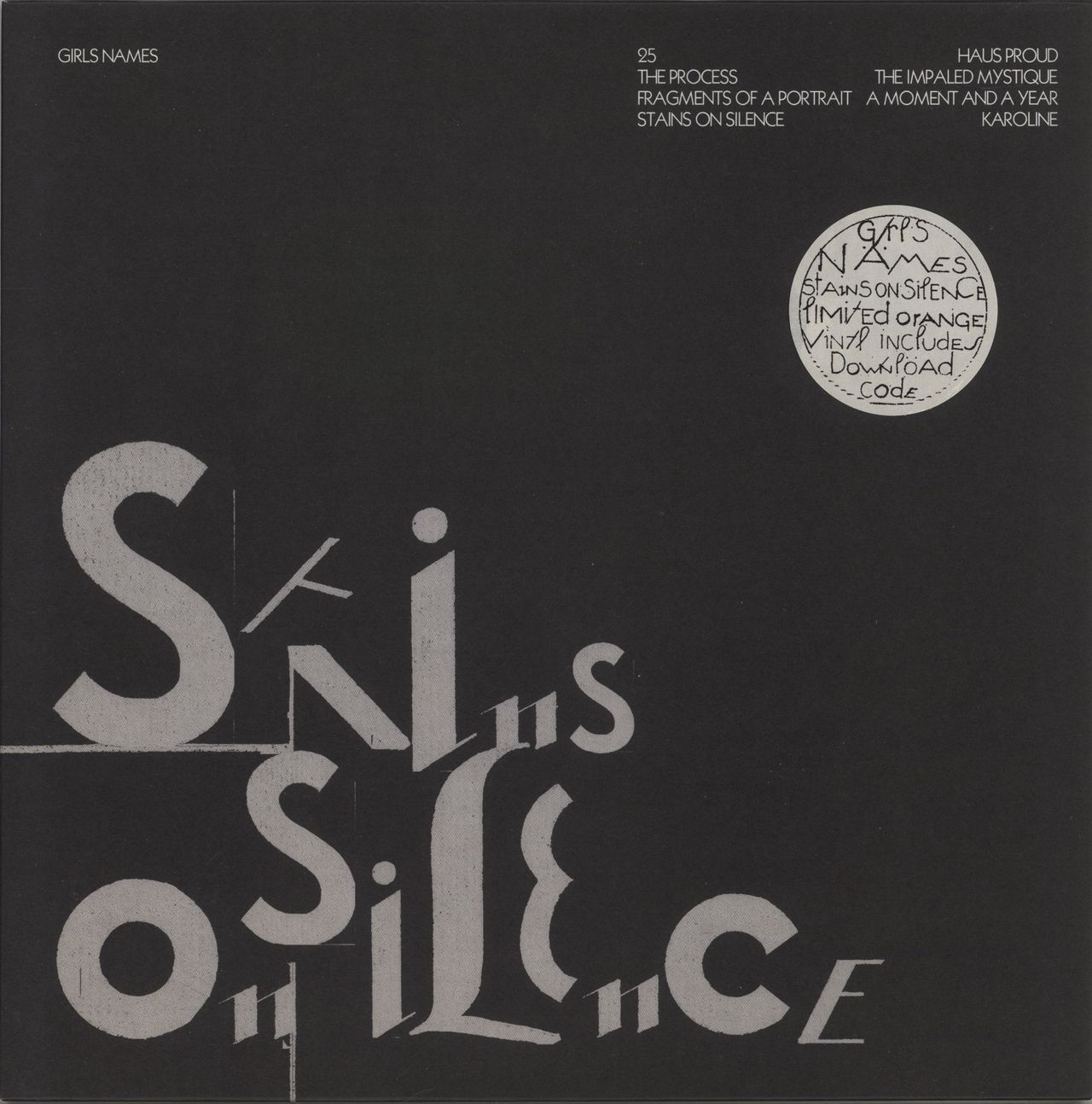 GIRLS NAMES Stains On Silence (2018 UK strictly limited edition Indie Store exclusive 8-track LP pressed on Orange Vinyl - From the Bang Bang bar-summoning swoon of opener 25 and the submerged disco doom ofHaus Proud to the rapt, dub-leaning Fragments of a Portrait, Girls Names have excelled in their goal by forging an LP of synchronous nuance and defiance. The black variant picture sleeve has its hype sticker affixed to the front and comes with the lyric printed inner while the vinyl looks barely played)