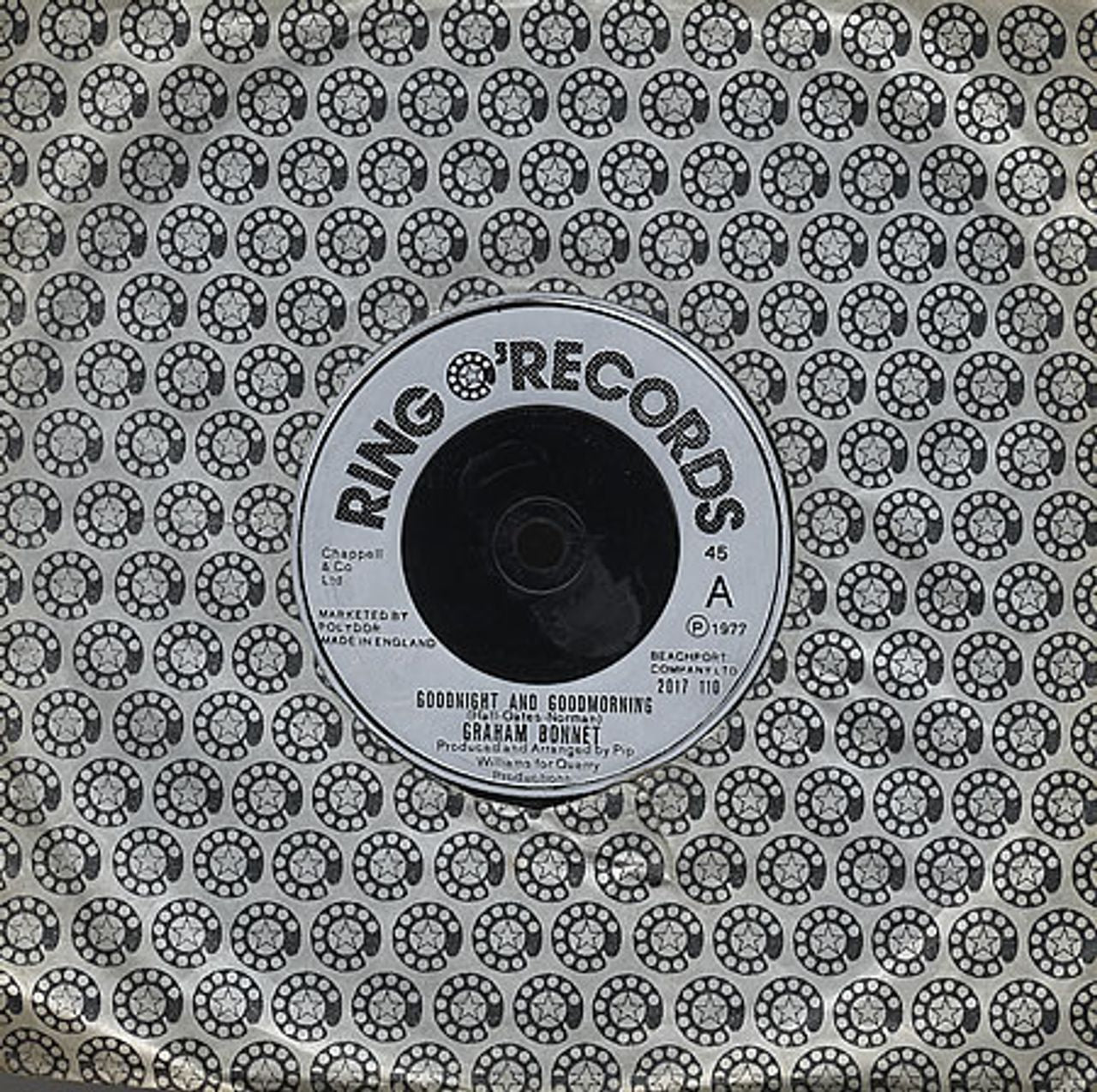 GRAHAM BONNET Goodnight & Goodmorning (1977 UK injection moulded 7" vinyl single on Ringo Starr's Ring O' Records, also featuring Wind Song, die-cut company sleeve. Despite a small pen marking both sides of the label for review, this copy is in Excellent condition with very few signs of play)