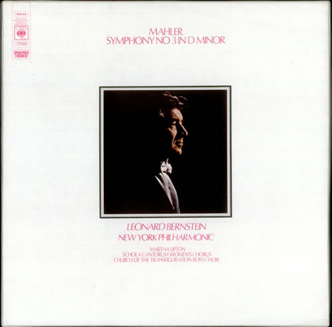 MAHLER Symphony No. 3 in D minor (1973 UK CBS label 6-track stereo double vinyl LP boxed set, performed by the New York Philharmonic Orchestra with the Schola Cantorum Women's Chorus and the Church of the Transfiguration Boy's Choir conductedby Leonard Bernstein, presented in a glossy, book opening record box with insert. The sleeve and box shows minimal wear and the vinyl appears barely played 77206)