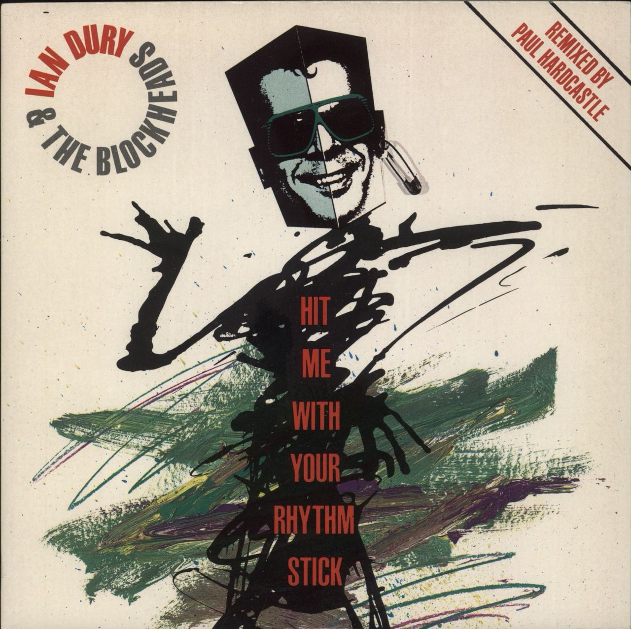 IAN DURY & THE BLOCKHEADS Hit Me With Your Rhythm Stick (1984 UK Stiff 7" vinyl single featuring the Paul Hardcastle Remix plus Sex & Drugs & Rock & Roll, glossy picture sleeve BUY214)
