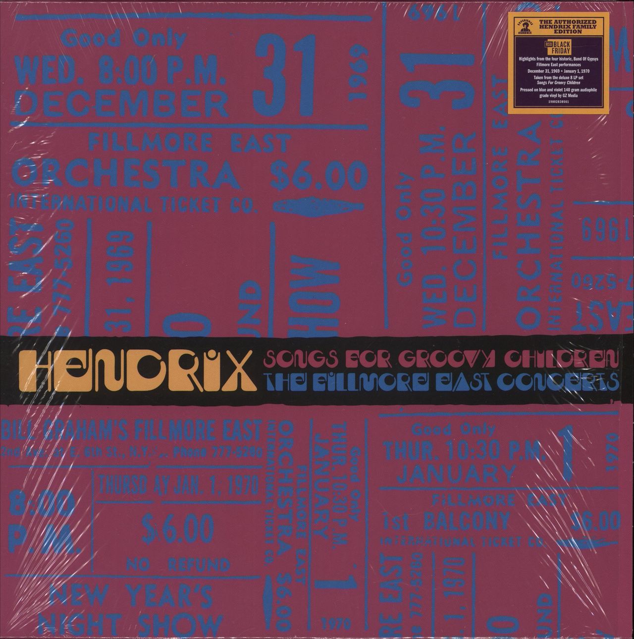 JIMI HENDRIX Songs For Groovy Children: The Fillmore East Concerts (2024 UK/EU limited edition LP released exclusively for Record Store Day 'Black Friday' pressed on 140-gram trippy Blue & Violet Swirl Vinyl, featuring highlights from the box that documented The Band Of Gypsy's stand at the Fillmore East on New Years Eve 1969 and New Years Day 1970. The picture sleeve retains its opened hype-stickered shrinkwrap and the vinyl looks barelyplayed)