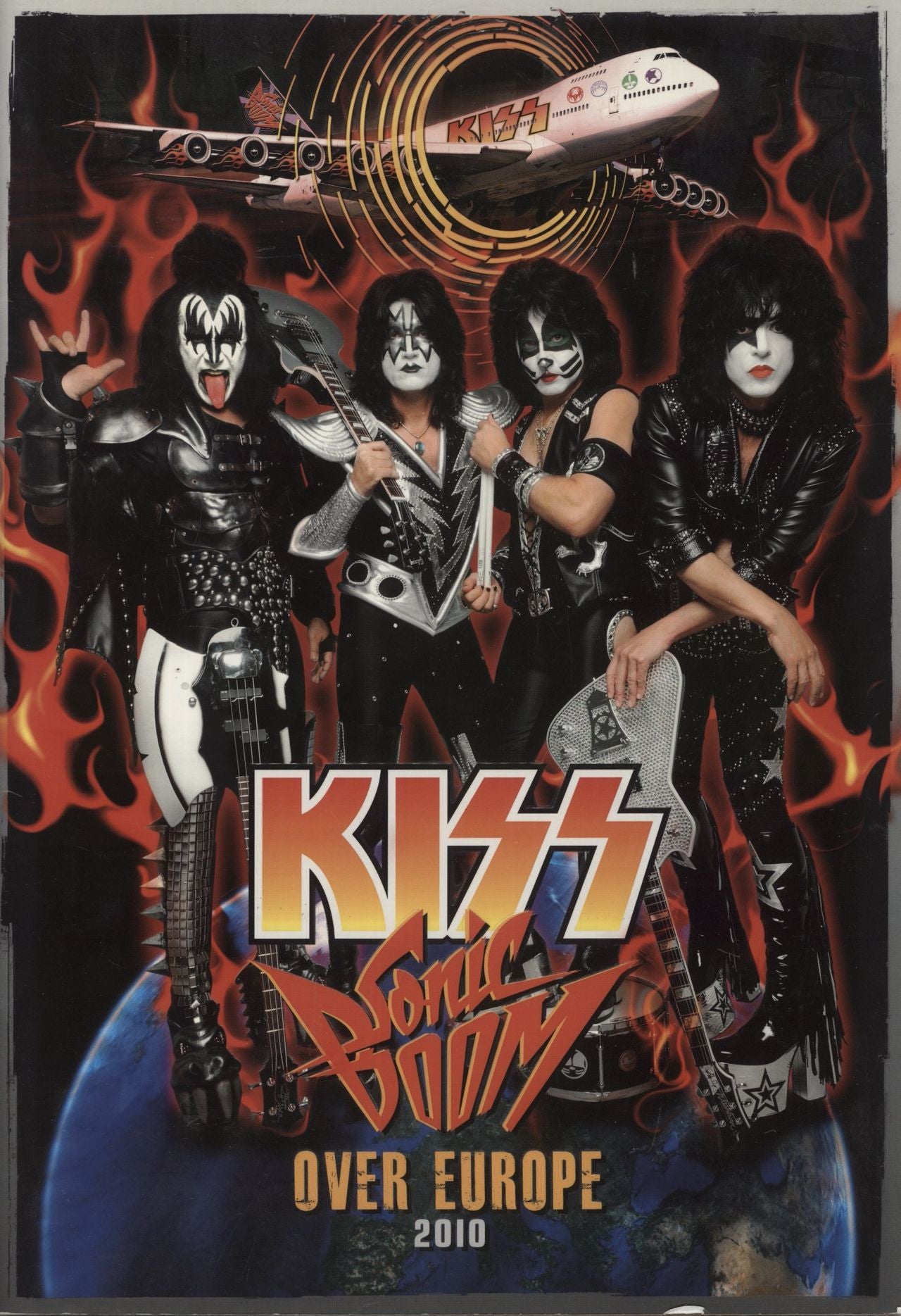 KISS Sonic Boom Over Europe 2010 (UK & European 2010 40-page Tour Programme, with forward by Keith Leroux and Jill Cataldo featuring dazzling review quotes from Kerrang!, Rolling Stone, Classic Rock and Metal Hammer, featuring cover tocover dedicated to amazing full colour live photos and press shots including a fantastic middle page spread of the band, also featuring quotes from the band members and full tour personnel credits, glossy lavish embossed front cover broadsheetsized featuring the band in their full get-up glory and the custom tour plane! It's like they never changed in over 35 years of gigging! Also includes a ticket stub for the 13th May show at Wembley Arena in London)