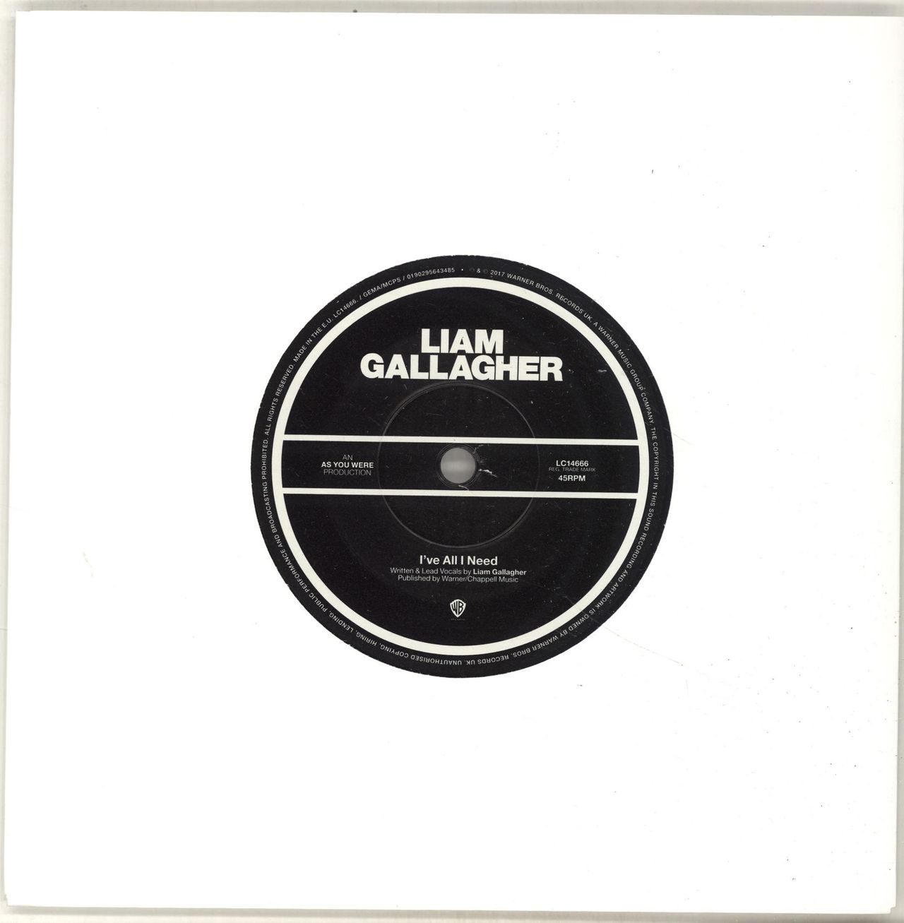 LIAM GALLAGHER I've All I Need (2018 UK limited edition single sided 7" single etched with the lyrics on Side B. Taken from his debut solo album 'As You Were', the track was notably inspired by a meeting Gallagher had with Yoko Ono nearly twodecades prior. Housed in plain die-cut card sleeve with barcode sticker)