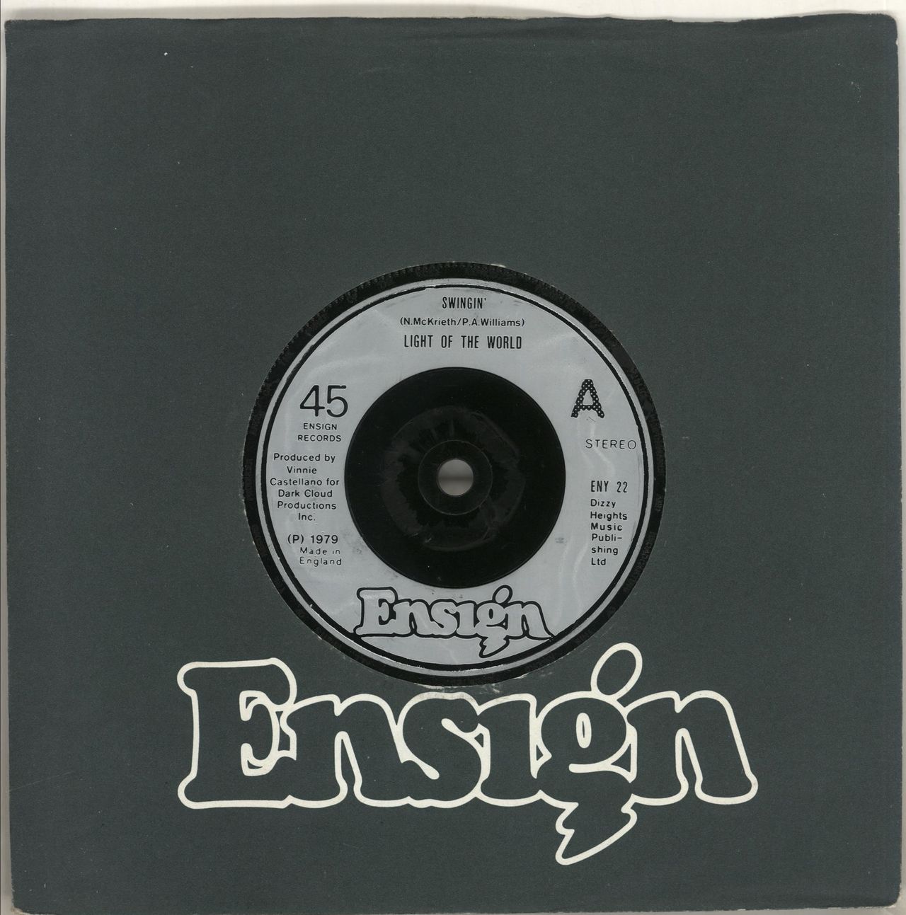 LIGHT OF THE WORLD Swingin' (1979 UK injection mouded 7" vinyl single, also including The World Is Out, Ensign company die-cut sleeve ENY22)