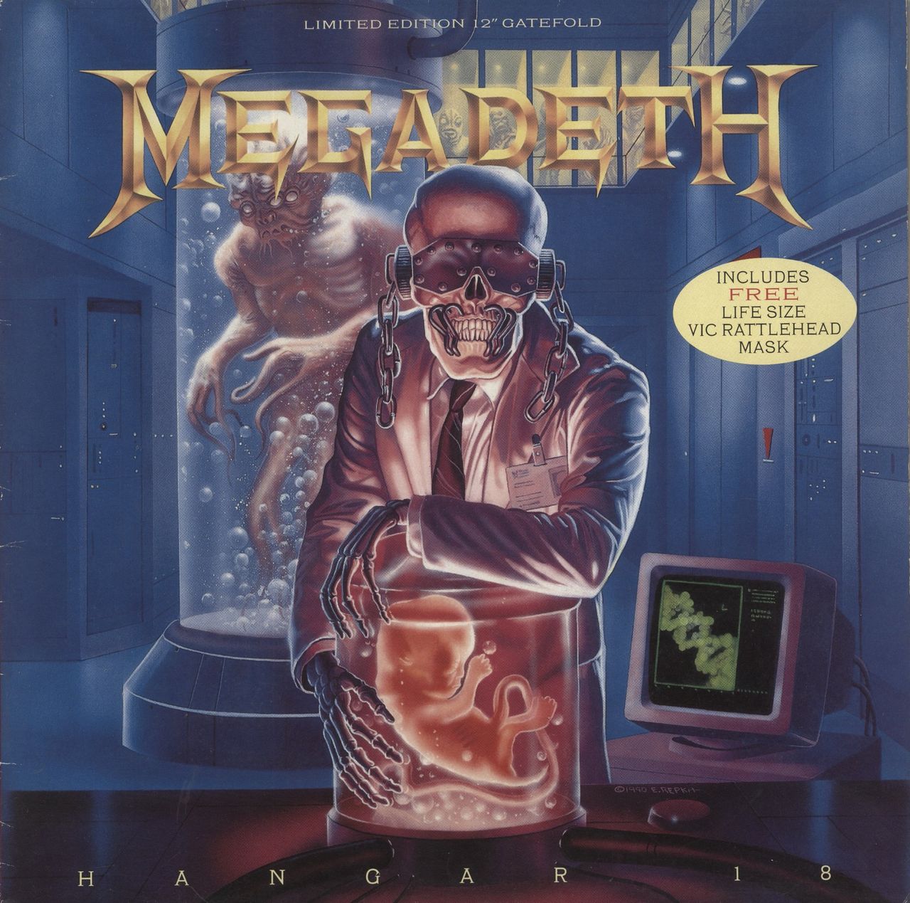 MEGADETH Hangar 18 (1990 UK limited edition 4-track 12" vinyl EP, also includes live versions of Hangar 18, The Conjuring and Hook In Mouth recorded at London's Wembley Arena on 14th October 1990, housed in the glossy gatefold picture sleeve with the UK tour dates on the back plus the intact 'Vic Rattlehead' cut-out mask inside. The sleeve displays some minor wear mostly to the edges, and the vinyl shows minimal signs of play 12CLG604)