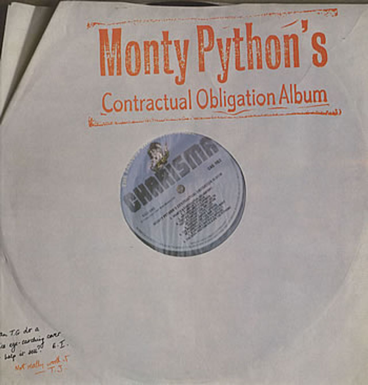 MONTY PYTHON Contractual Obligation Album (1980 UK 24-track comedy vinyl LP with custom designed labels & a rather ridiculous sleeve, complete with the die-cut credits inner. This is the first pressing with the track 'Farewell To John Denver',which contained a few bars of Eric Idle impersonating John singing a parody of 'Annie's Song', followed by the sound of the singer being strangled! This was removed on subsequent releases following legal advice, & replaced by an apology spokenby Terry Jones. This original version also contains an unintentionally out-of-sync mix of 'I'm So Worried'! CAS1152)
