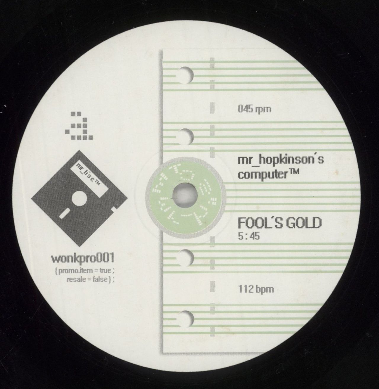 MR HOPKINSON'S COMPUTER Fool's Gold (2006 UK 4-track 10" vinyl promotional EP. Cover versions of Stone Roses, Pixies, Radiohead and the start of a Smiths song get the ambient chiptune treatment. Plain die-cut sleeve. The vinyl is Excellent with only light signs of play WONKPRO001 )