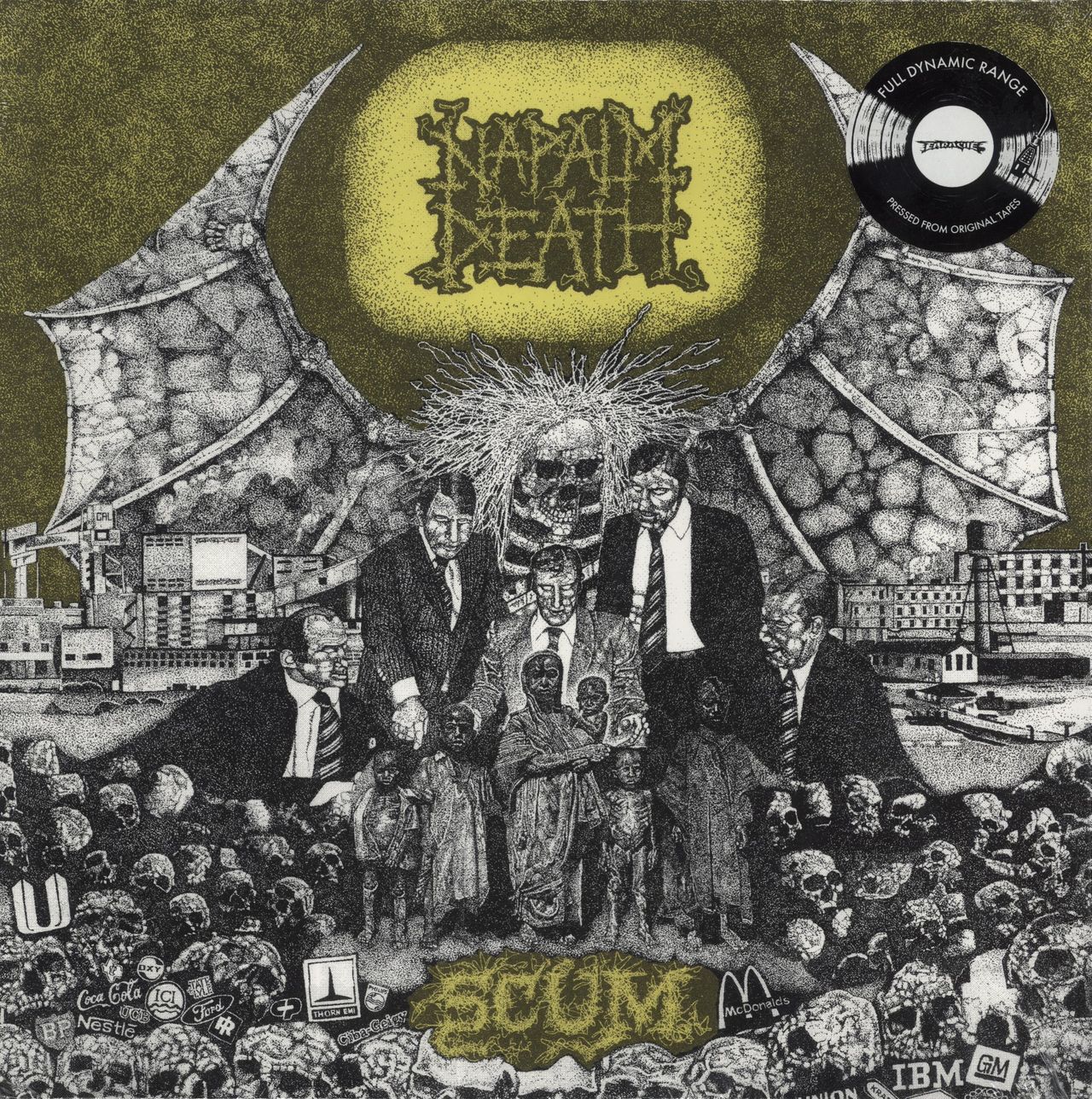NAPALM DEATH Scum (2017 UK vinyl LP, the 1987 debut by the undisputed world's fastest band, featuring 28 songs of intense, manic and savagely brutal hardcore-thrash. Housed in a matte green toned sleeve with hype-stickered shrink and lyric/photo inner. The sleeve shows a little creasing to the corner, whilst the vinyl remains in Near Mint condition MOSH003FDRUS)