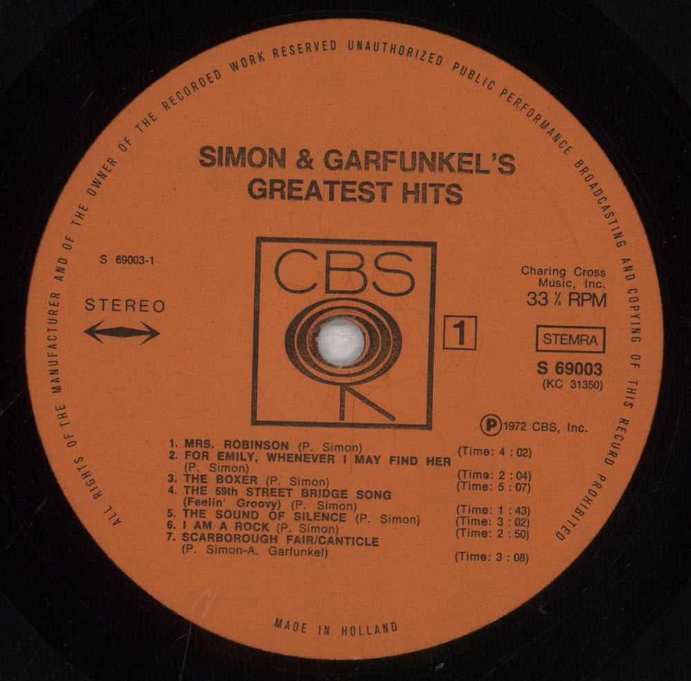 SIMON & GARFUNKEL Greatest Hits (1972 Dutch plain orange label 14-track LP compilation, including the classic hits Mrs Robinson, The Boxer, The Sound Of Silence, I Am A Rock, Scarborough Fair, Bridge Over Troubled Water & more. The picture sleeve & vinyl are in superb Excellent condition)