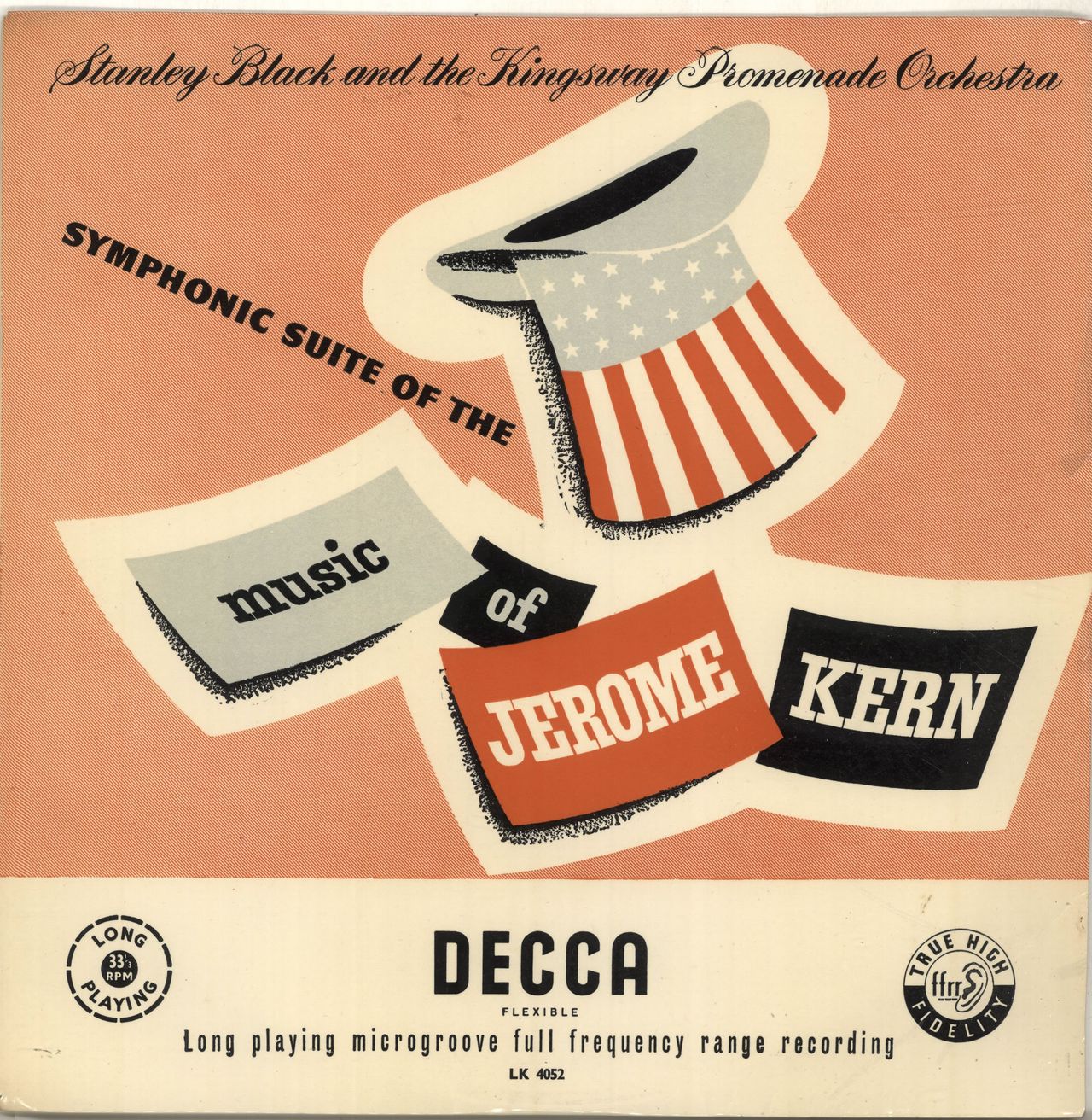 STANLEY BLACK conducting THE KINGSWAY PROMENADE ORCHESTRA Symphonic Suite Of The Music Of Jerome Kern (1955 UK 14-track mono LP on a red & gold unboxed Decca label, fully laminated picture sleeve with scalloped flipbacks. The flimsy sleeve shows some light creasing from ring wear & the heavyweight vinyl is Excellent with few signs of play LK4052)