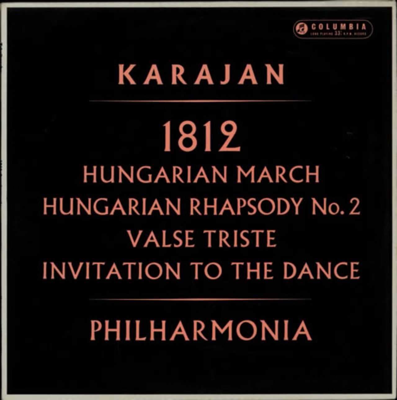 HERBERT VON KARAJAN conducting THE PHILHARMONIA ORCHESTRA 1812 Overture / Hungarian March / Hungarian Rhapsody No.2 / Valse Triste / Invitation To The Dance (1959 UK 5-track mono LP featuring the famous works by Tchaikovsky, Berlioz, Liszt, Sibelius & Weber, front laminated flipback picture sleeve. The sleeve shows light wear with discolourtion to the reverse & the vinyl remains in fantastic near 'as new' condition with little sign of play 33CX1571)