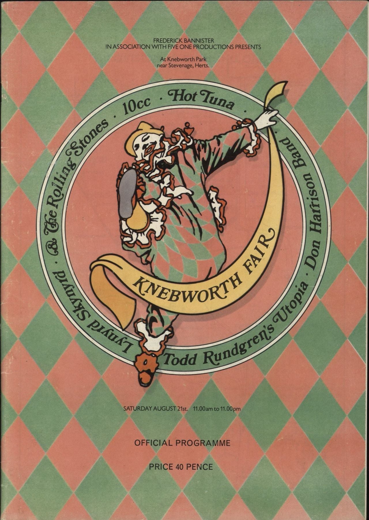 VARIOUS Knebworth Fair August 21st 1976 (Rare original official 1976 UK 28 page programme for the Rolling Stones' gig at Knebworth Park, also featuring Lynyrd Skynyrd, Hot Tuna, 10cc and Todd Rundgren's Utopia. This copy is showing few signs of age with minimal wear or colouration and is free from any rips or tears, remaining in great condition. A wonderful souvenir of one of the legendary Knebworth festivals of the Seventies!)