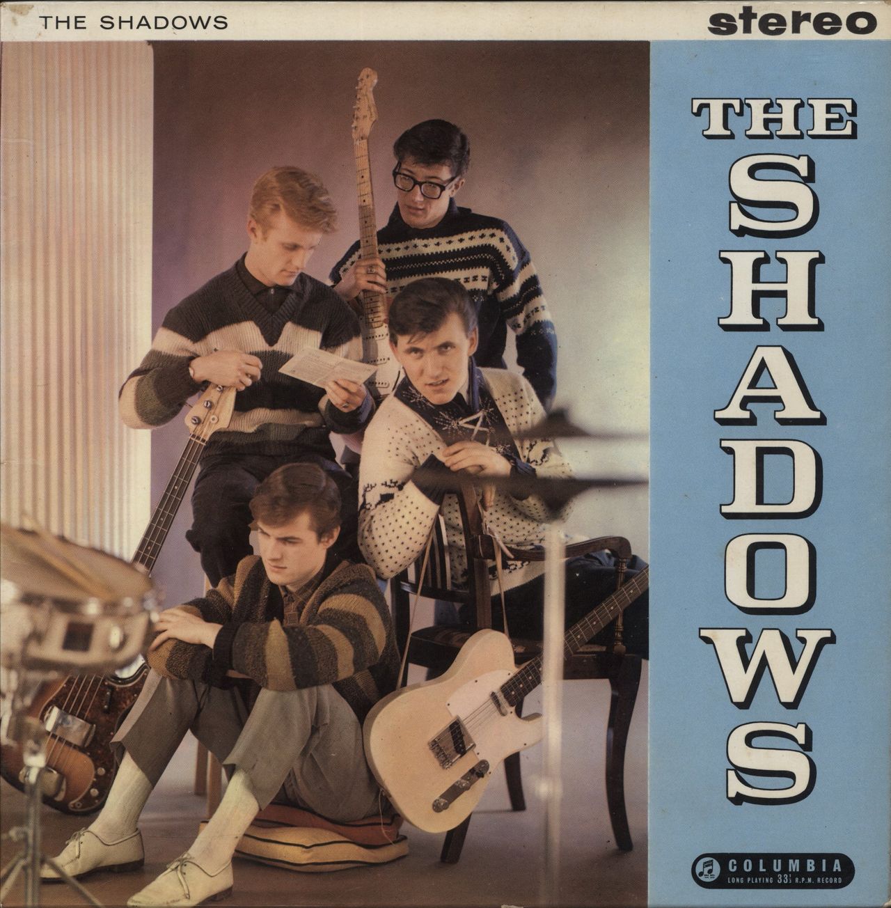 THE SHADOWS The Shadows (Rare 1961 UK green & silver Columbia label first issue 14-track STEREO LP, front laminated flipback picture sleeve with 'Emitex' inner. The sleeve displays light wear with the flipacks intact and the non-laminate back showsng some light discolouration. The vinyl has the odd light sign of play with just the odd paper scuff, overall a really nice example of this classic debut LP! SCX3414)