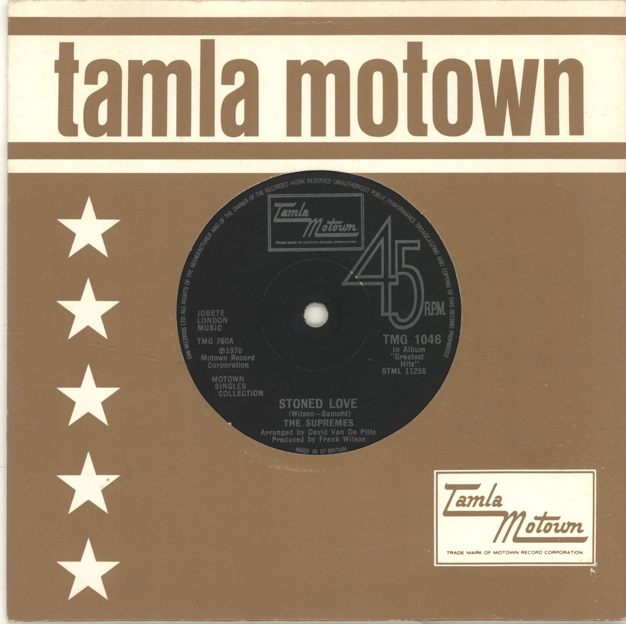 THE SUPREMES Stoned Love (1976 UK 7" vinyl single with intact four prong centre, issued as part of the 'Motown Singles Collection' series, also including Nathan Jones and comes in Tamla Motown company die-cut card sleeve TMG1046)