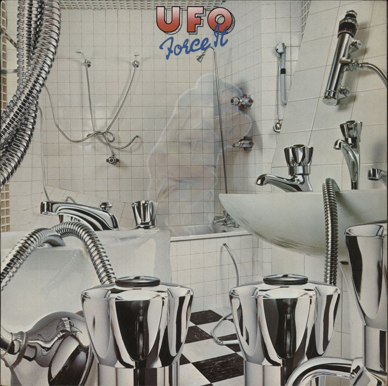 UFO Force It (1975 Canadian 9-track vinyl LP on the graduated blue Chrysalis label, including the singles Shoot Shoot & High Flyer. The 'faucet' picture sleeve was designed by Hipgnosis & features a faded out kissing couple [Genesis P Orridge& Cosey Fanni Tutti, bothlater of Throbbing Gristle]. The cover displays some light general wear and the vinyl has only a few light cosmetic surface scuffs, overall an Excellent example CHR1074)