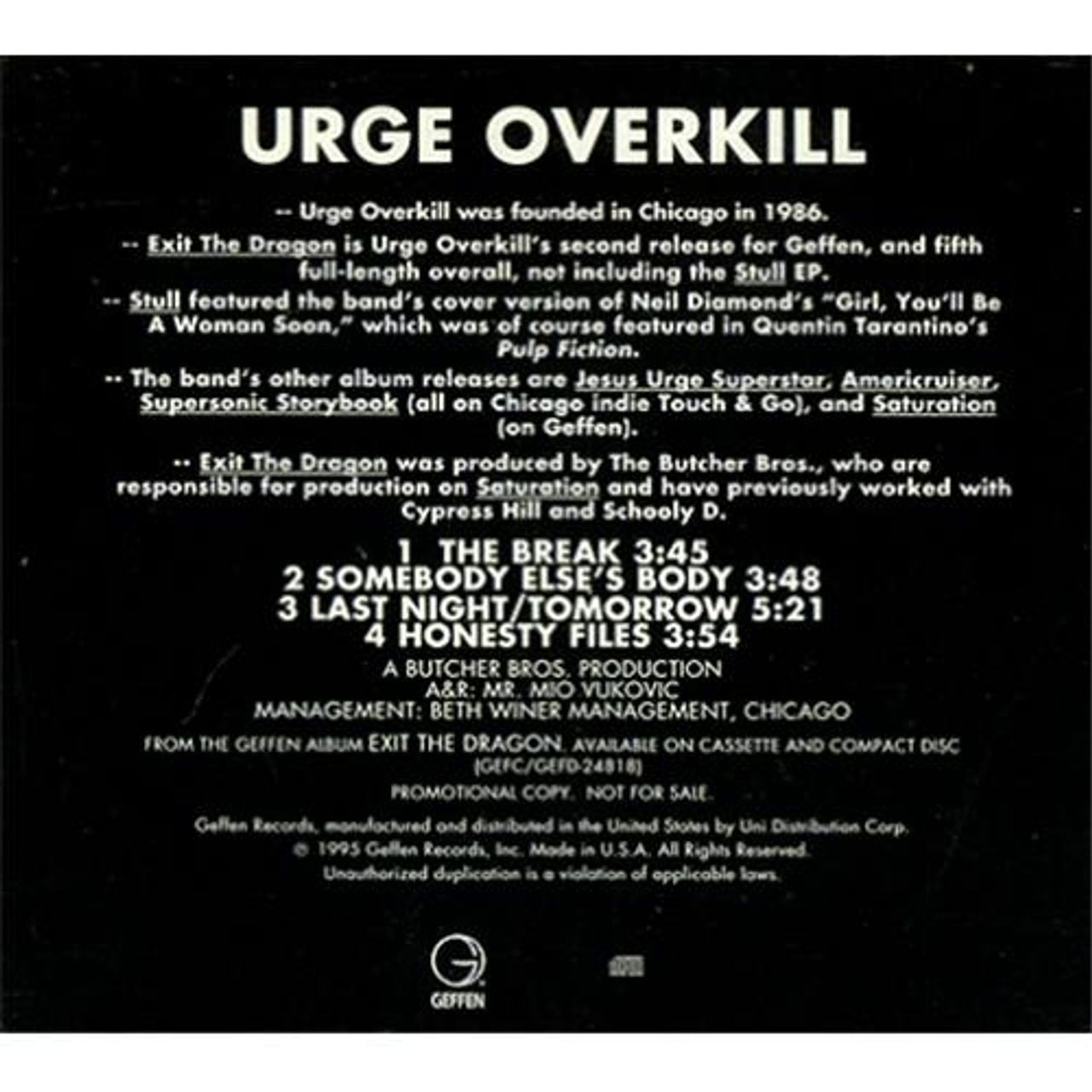 URGE OVERKILL 4 Cut Sampler (1995 US 4-track promotional
